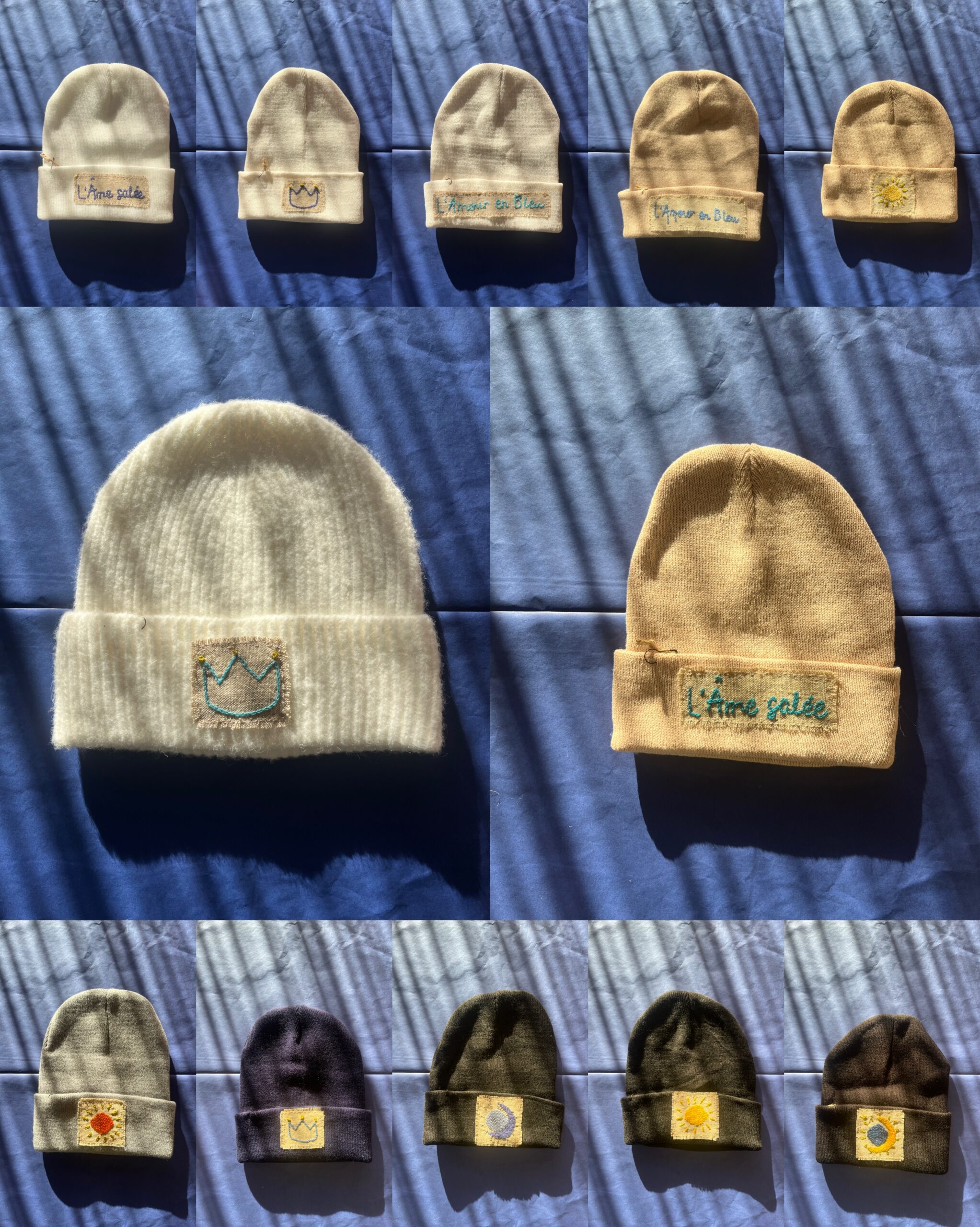 Chaque bonnet est brodé à la main avec intention, pour offrir non seulement un accessoire, mais un symbole : amour, lumière, authenticité.