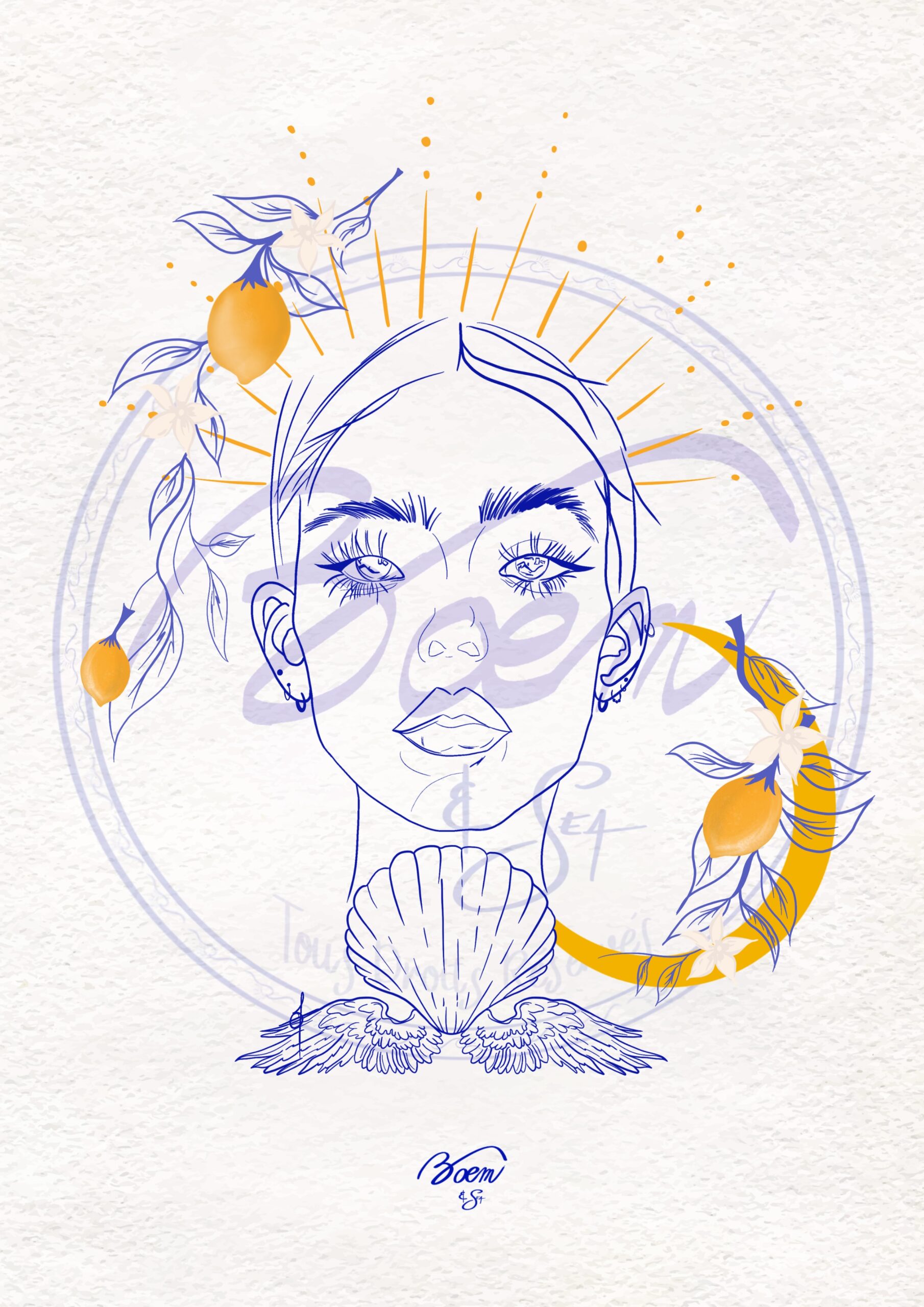Categories:All, Les Illustrations Tags:All, awakening, capri, Citrons, femme, Illustration, Lemon, lemons, limoncello, Méditerranéen, soleil, visage, Waves