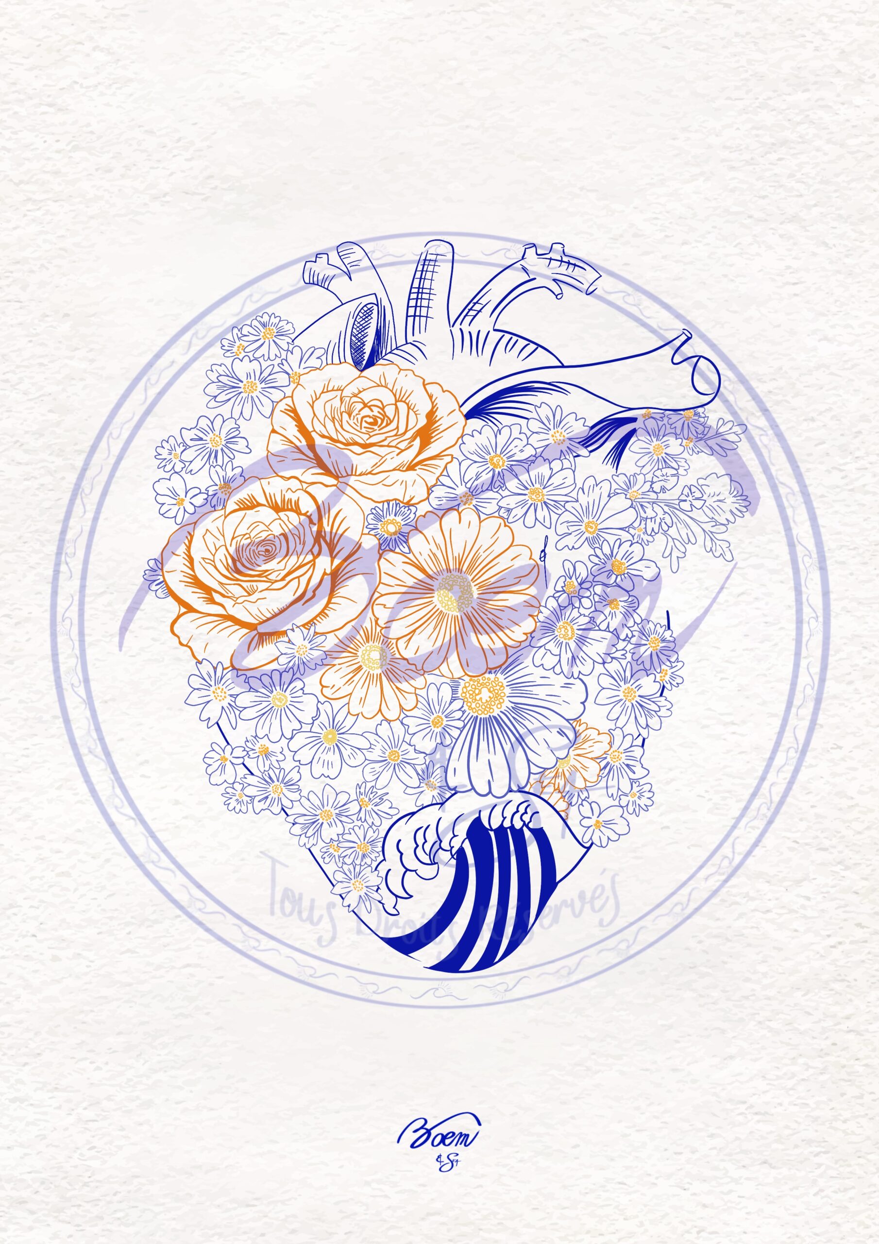 Alors la voilà : la version printanière du cœur d’ARTichaut, une version fleurie, toujours dans sa forme initiale d’organe avec une touche méditerranéenne. Les prints seront disponibles en A4 et A6 lors de mes événements de MAI ; sur Chateauneuf au Brucs et dans le village de Valbonne, j’ai hâte de vous voir l’adopter 🫀🌊🌸